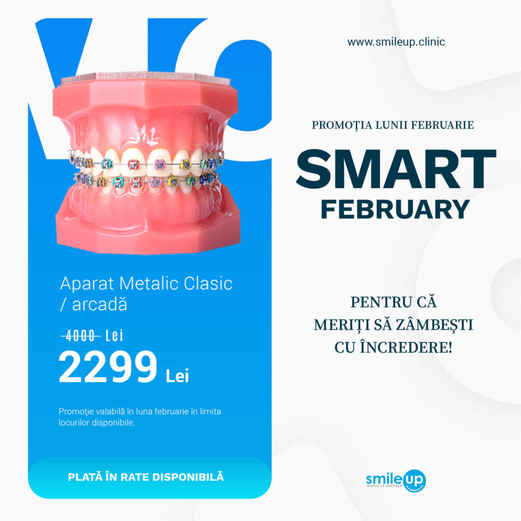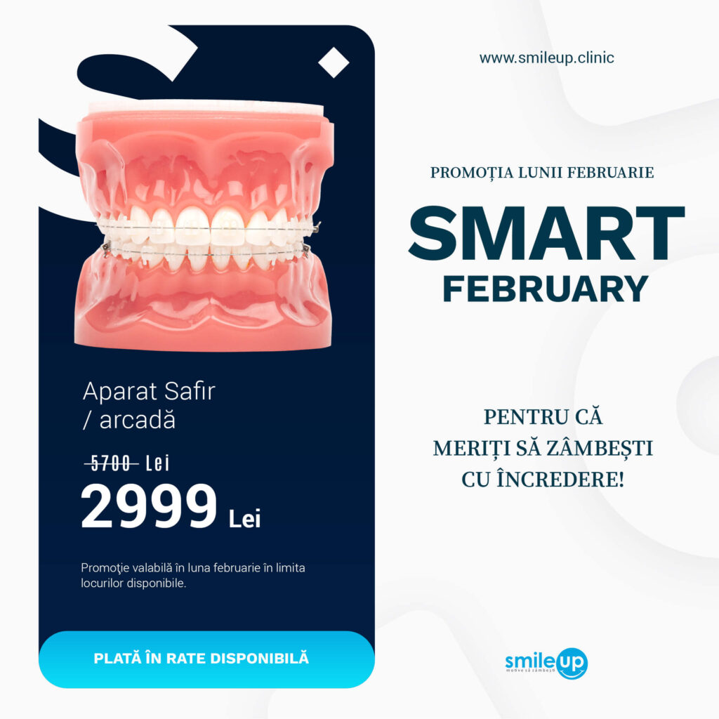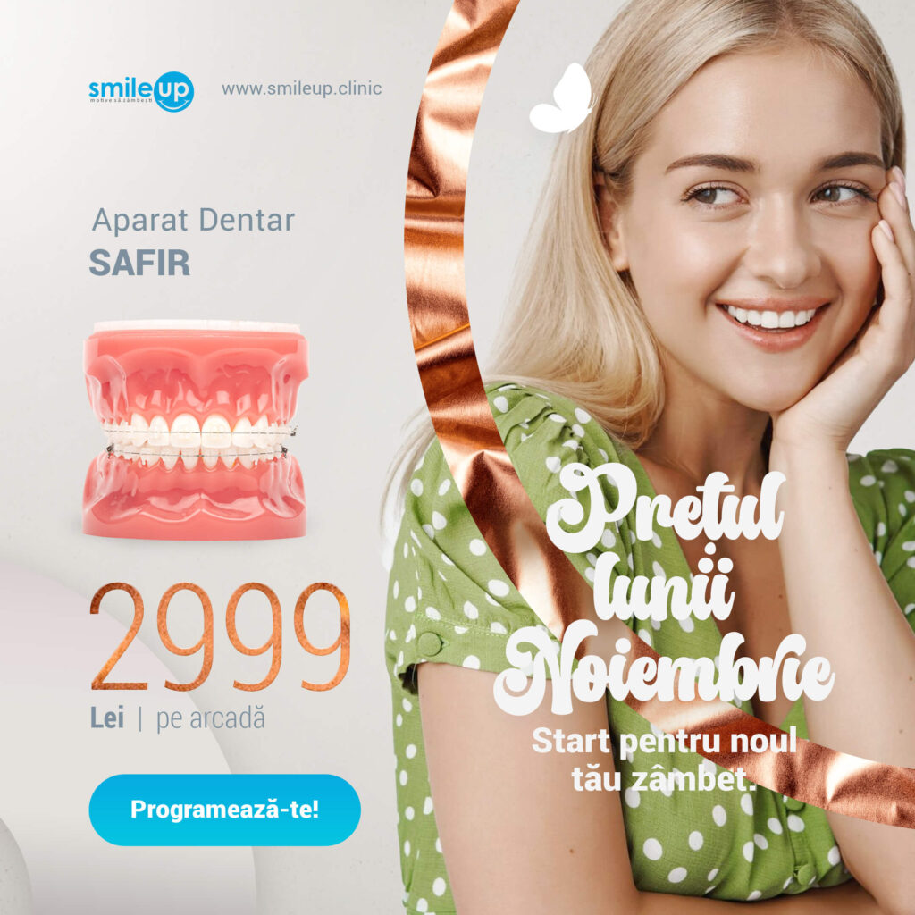 SmileUp oferă diverse tipuri de aparate ortodontice: Aparat Mobil pentru Copii, Aparat Dentar Clasic și Safir, Sistemul Damon, Aparatul Lingual Incognito, și soluții invizibile precum Invisalign și Spark. Aceste opțiuni acoperă de la tratamente tradiționale la soluții moderne și estetice.